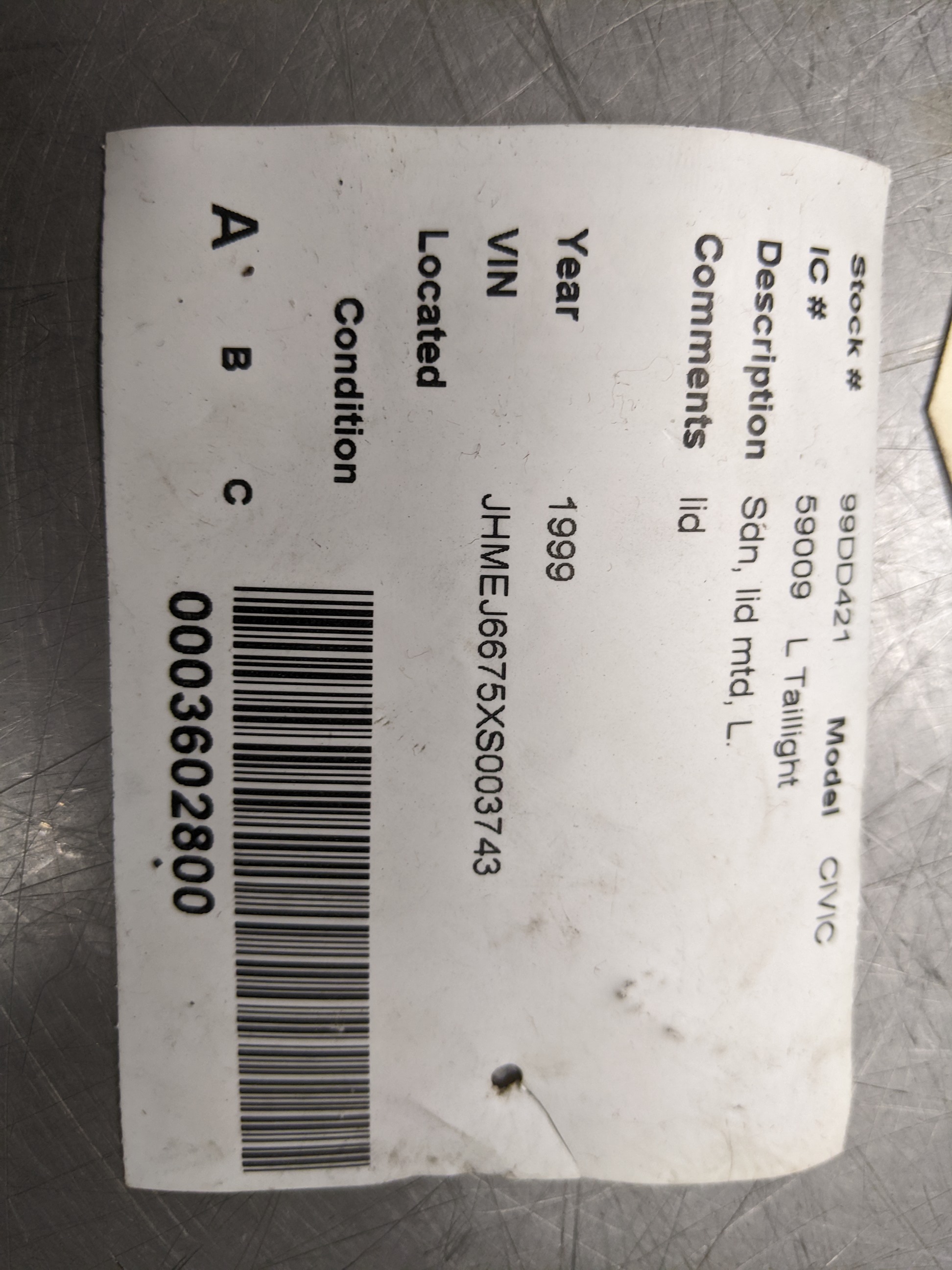 GTG102 Driver Left Deck Tail Light For 99-00 Honda Civic 1.6