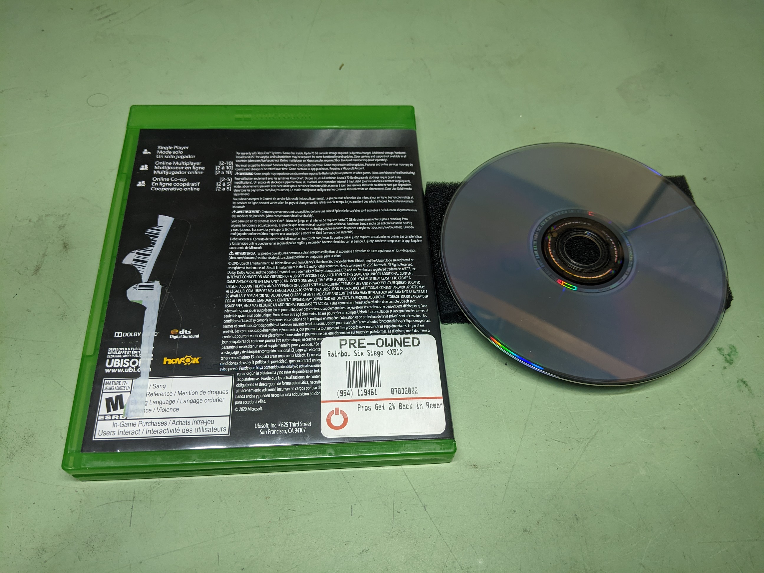 Rainbow Six Siege Microsoft XBoxOne Disk and Case